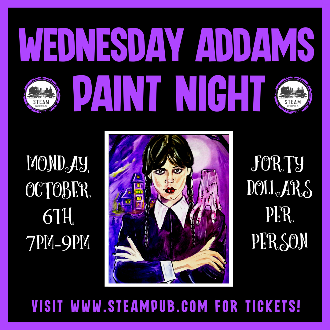 Channel your inner gloominess at Steam Pub’s Wednesday Addams Paint Night on Monday, October 6th at 7pm! We supply the paint, you supply the dark vibes. This event is ALL AGES and tickets are limited!