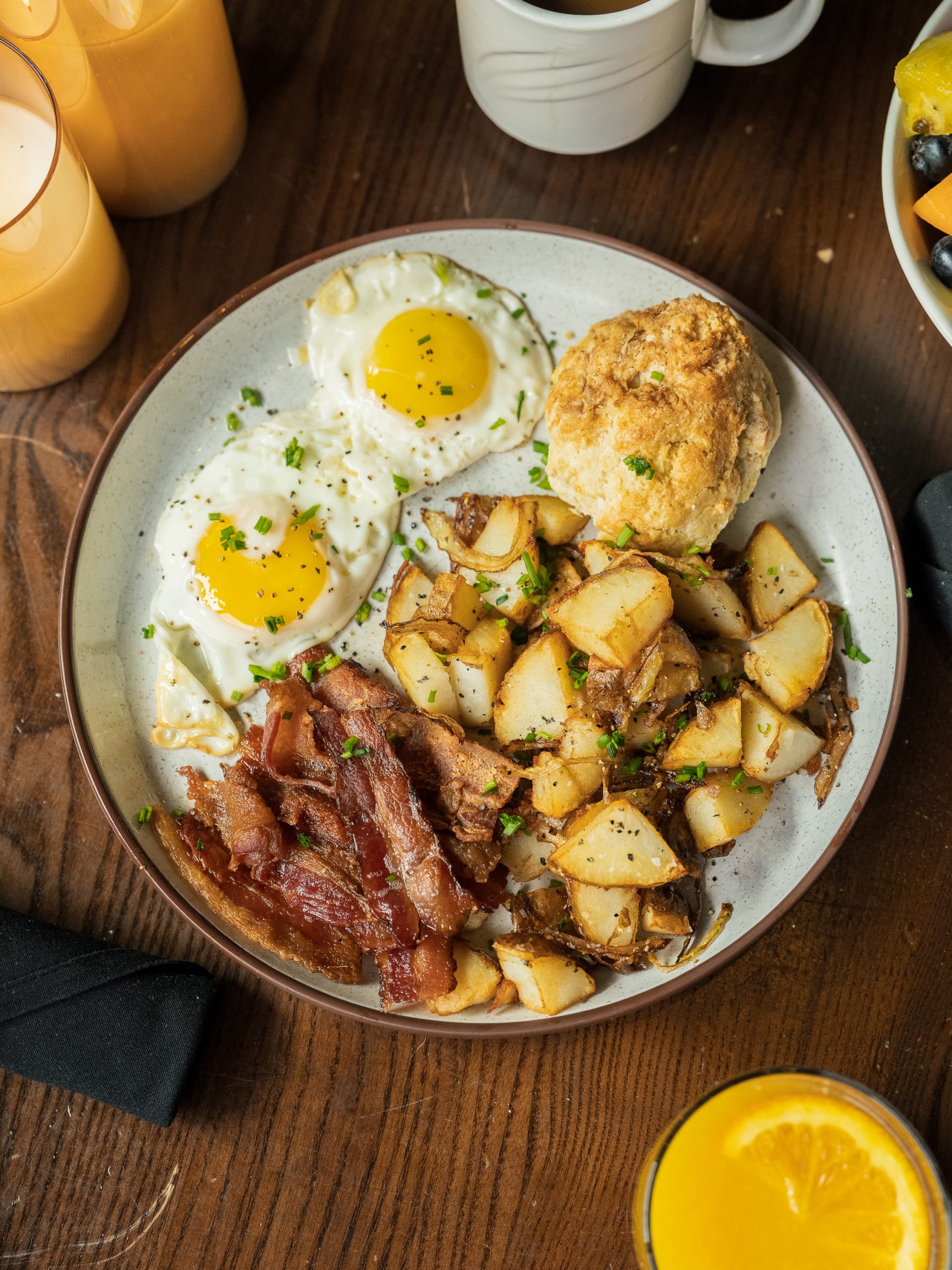 2 eggs any style, bacon or sausage, breakfast potatoes, and a biscuit